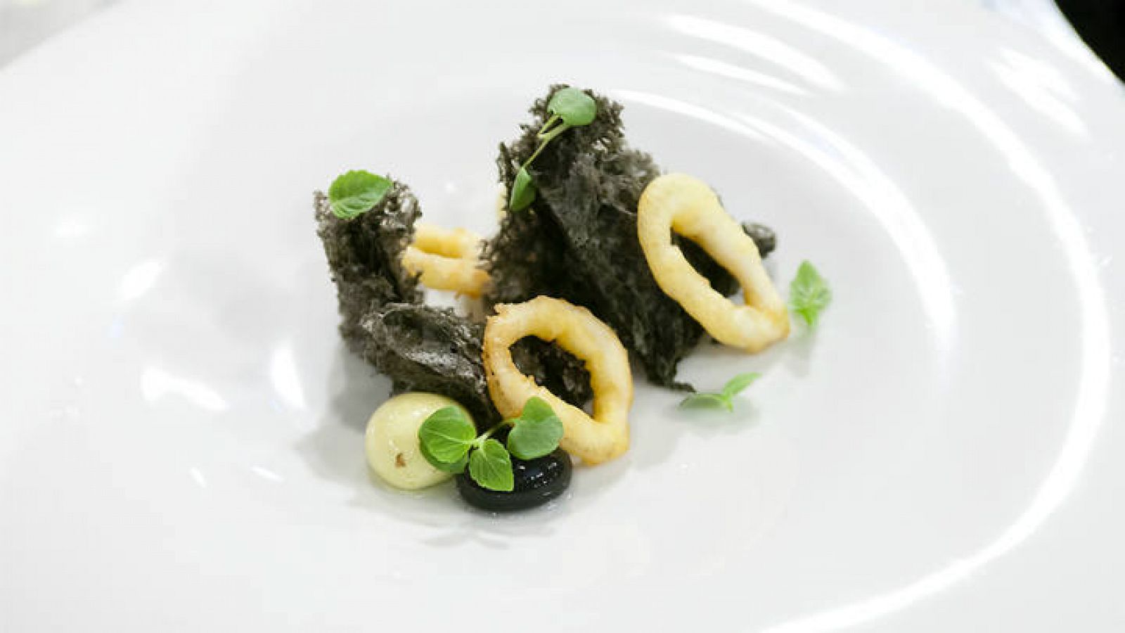 The calamari are usually dipped in flour and fried in olive oil.